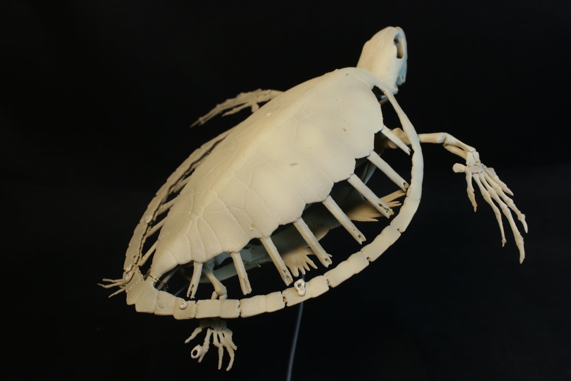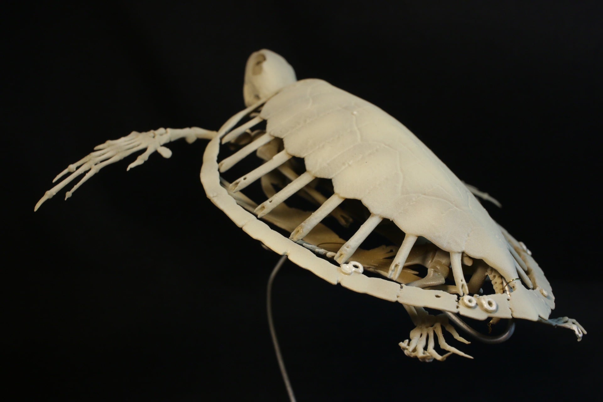 表面の着色は本物の骨を参考に再現し、博物館での展示にも耐えられる本格的なレプリカを作製しました。特に、身体に寄生するフジツボ類は骨と色味や質感を変えています。