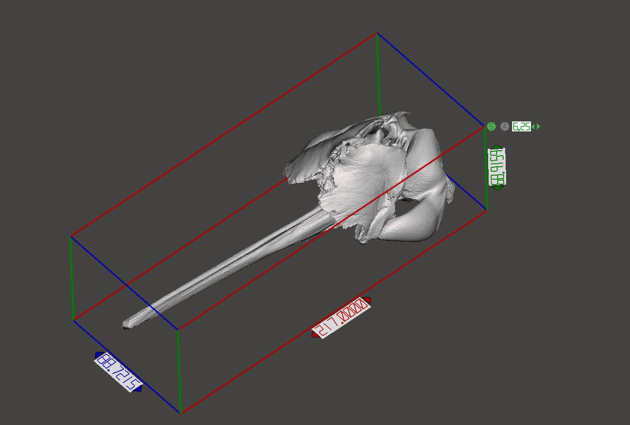 アンフィ合同会社ではこのガンジスカワイルカの3Dデータを基に光造形式の3Dプリンターを使って頭骨最大長217mmの二分の一レプリカを作成しました。サイズの詳細は画像の3Dデータをご覧ください。単位はすべてmmです。素材はABSライクの樹脂です。色は模型用塗料を使用し、骨の色に近づけて彩色しています。